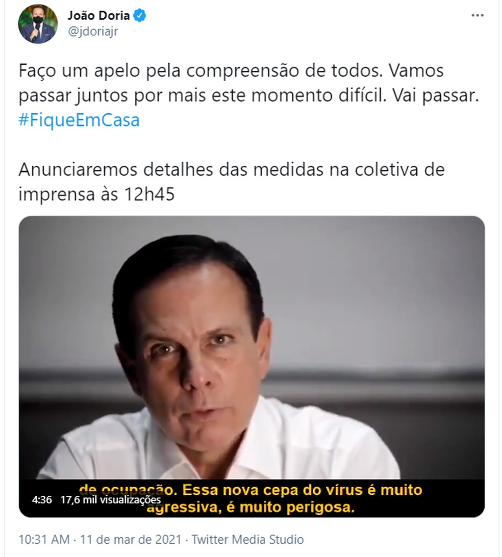 “Teremos que adotar medidas ainda mais restritivas de distanciamento social para diminuir a circulação do vírus no estado de SP. É a única forma para tentarmos, neste momento, conter a aceleração das mortes e evitar que tantas famílias sejam devastadas”, afirma Doria.