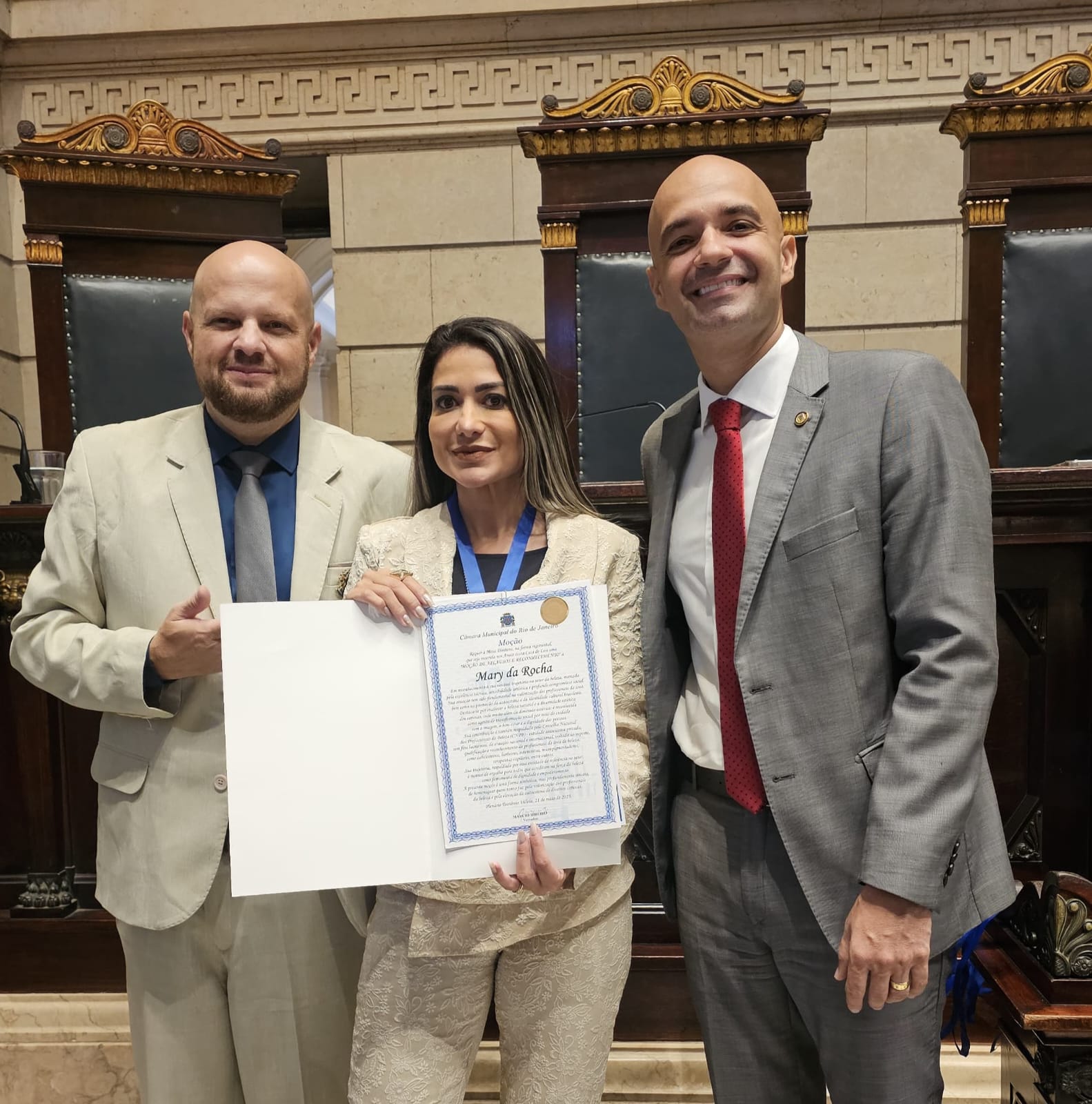 Em cerimônia solene realizada na Câmara Municipal do Rio de Janeiro no dia 26 de maio, a Dra. Mary Rocha homenageada como Perita Judicial Nacional e Internacional pelo Dr. Alexandre Vieira, presidente do Conselho Nacional dos Profissionais da Beleza (CNPB). A honraria reconhece sua trajetória marcada pela competência técnica, ética profissional e contribuição relevante para a valorização e desenvolvimento do segmento da estética no campo pericial.